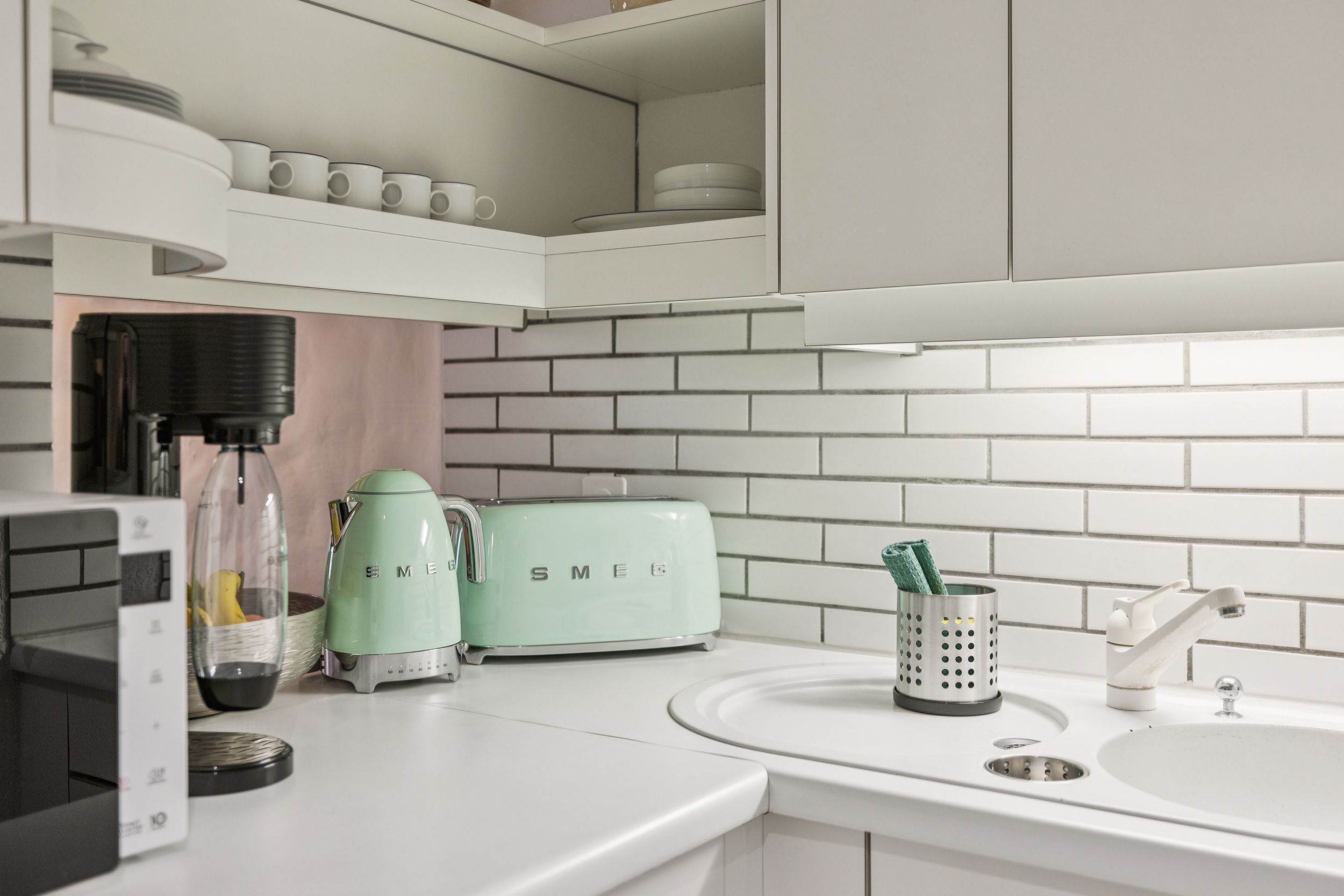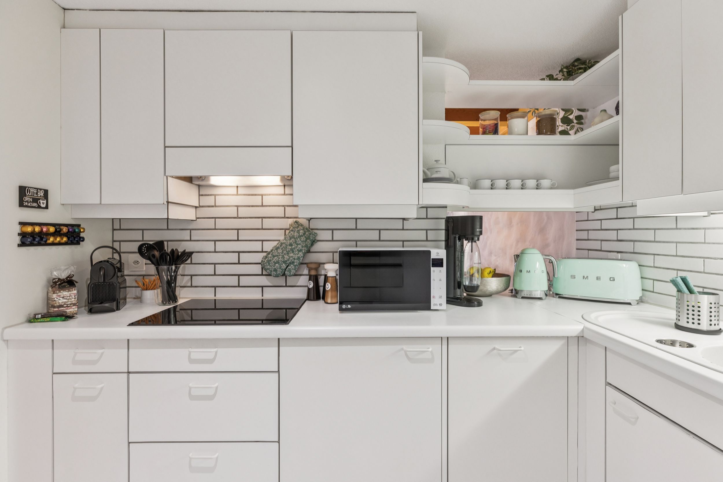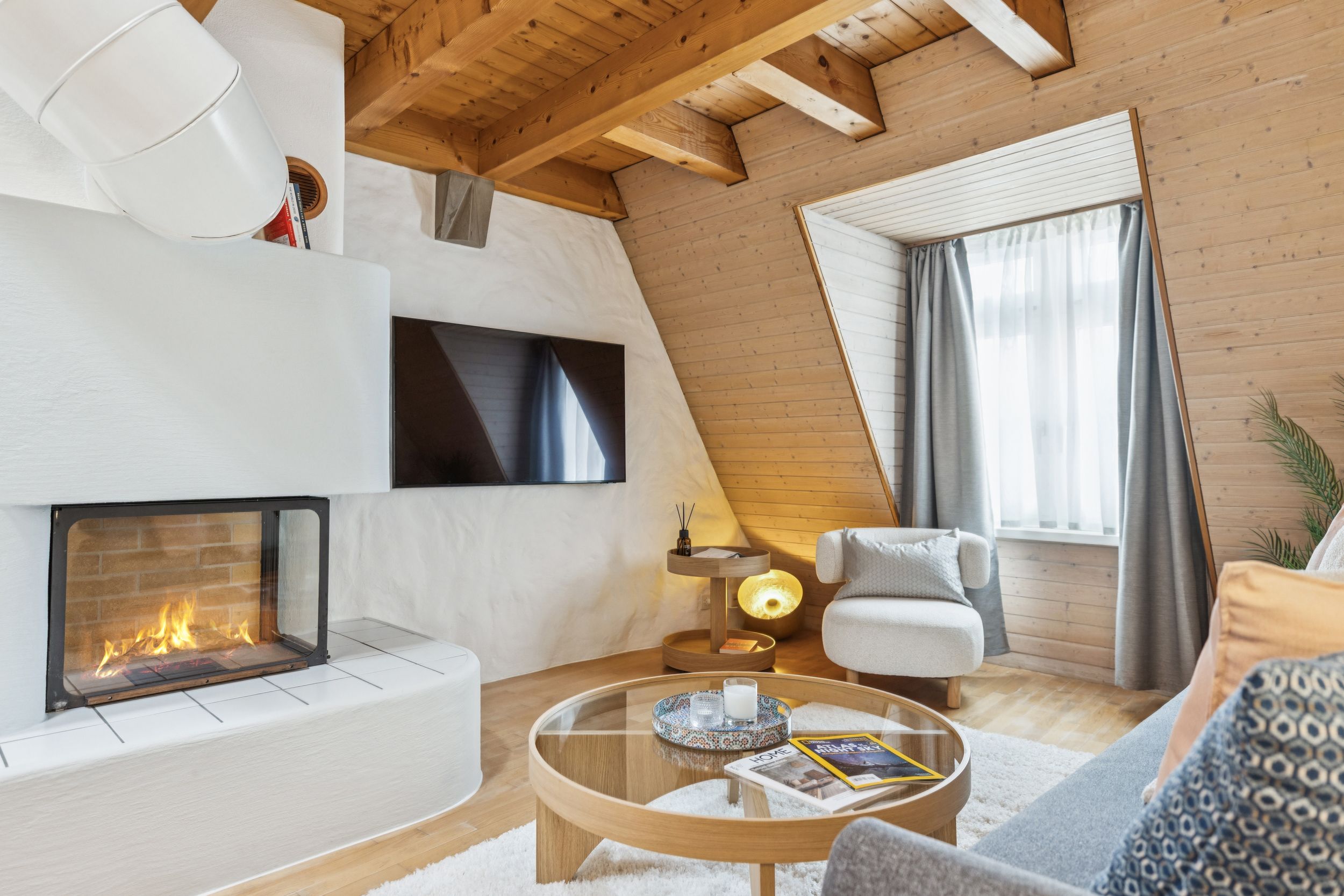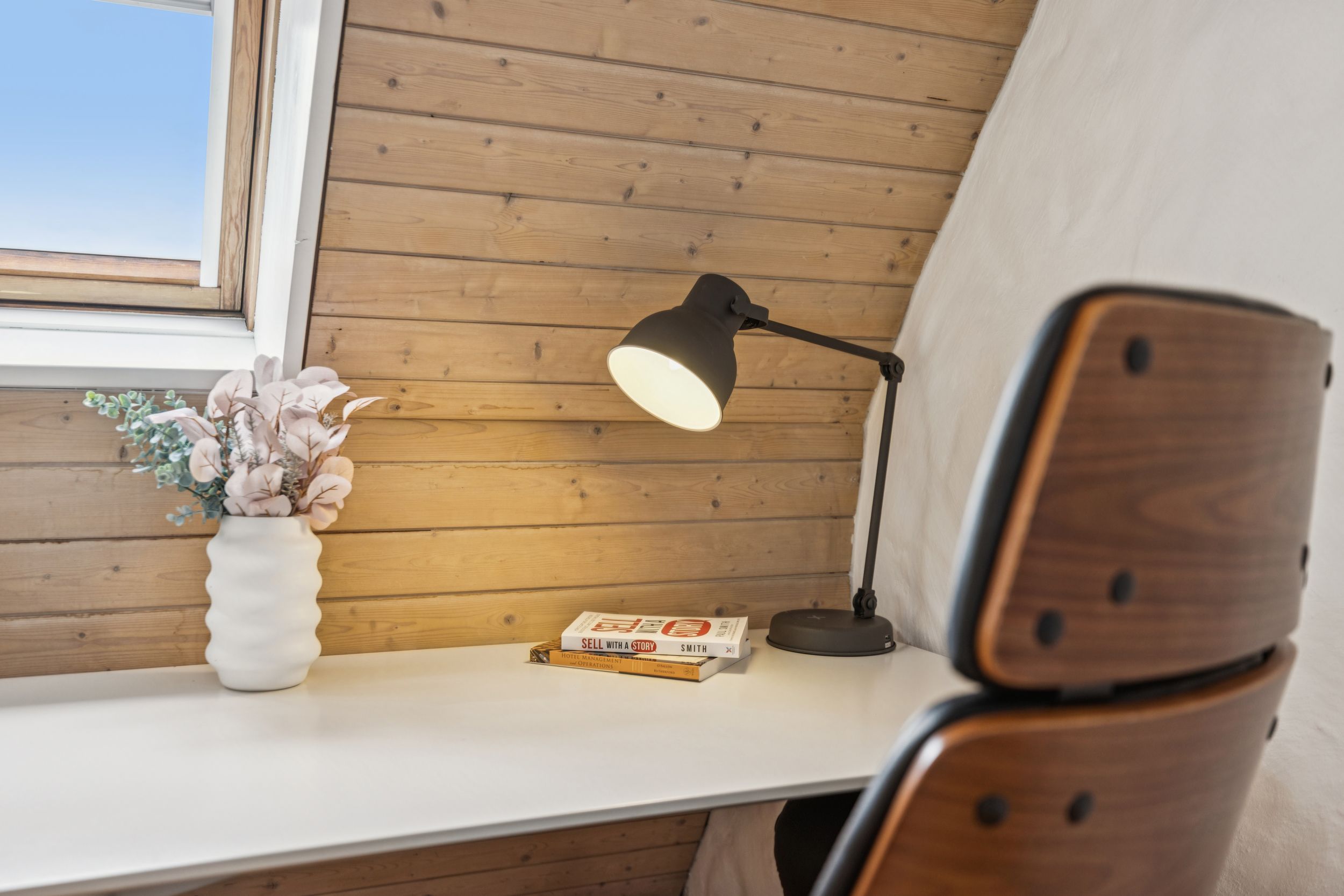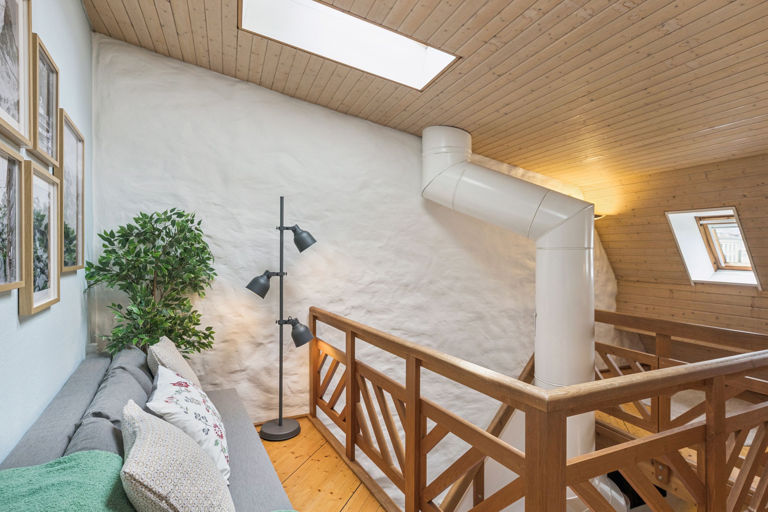 Above the main living space, a bright mezzanine level offers a flexible area for both work and relaxation. With a dedicated workspace and comfortable seating, it creates a quiet corner for reading, working, or simply enjoying the calm atmosphere of the apartment.