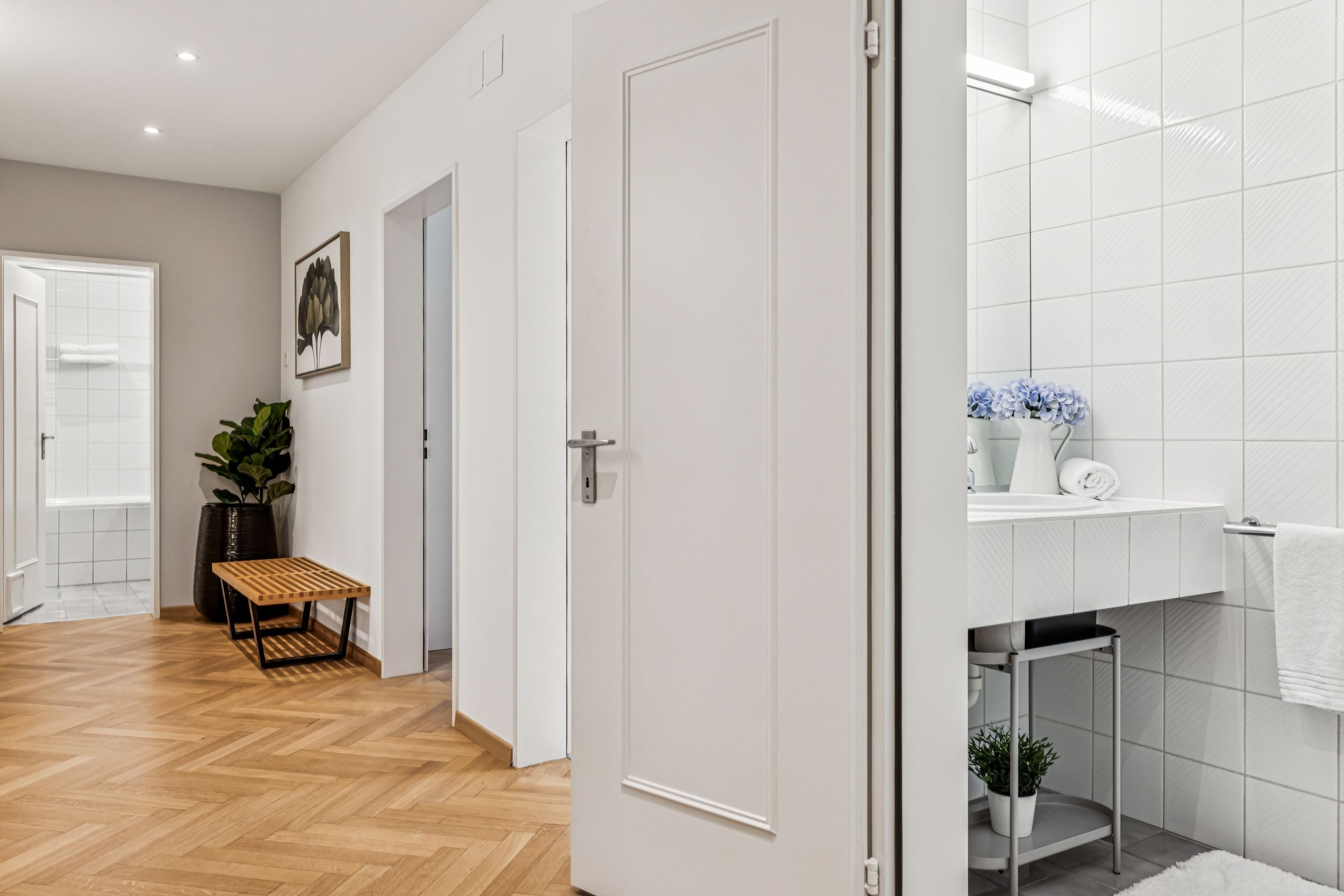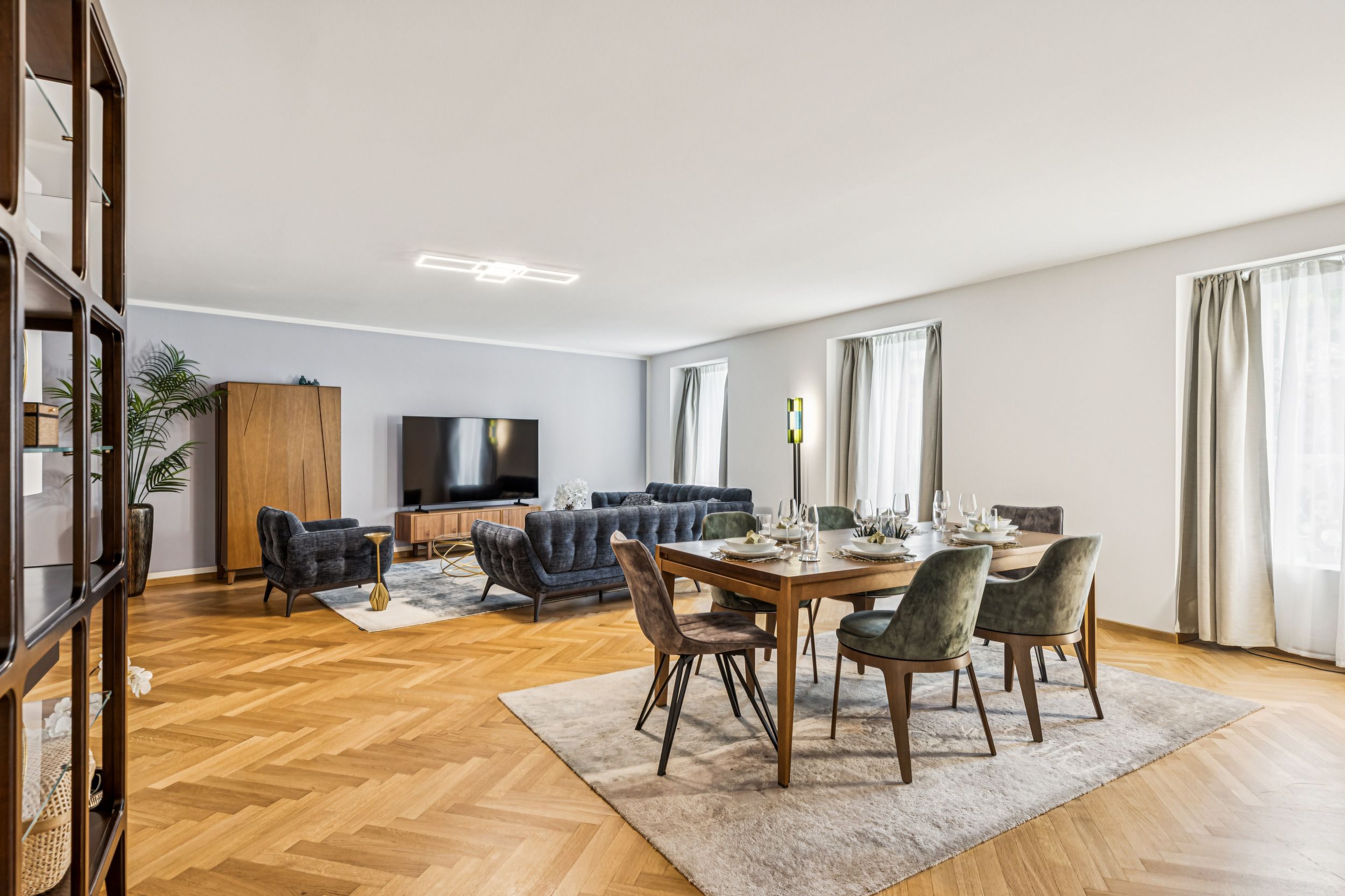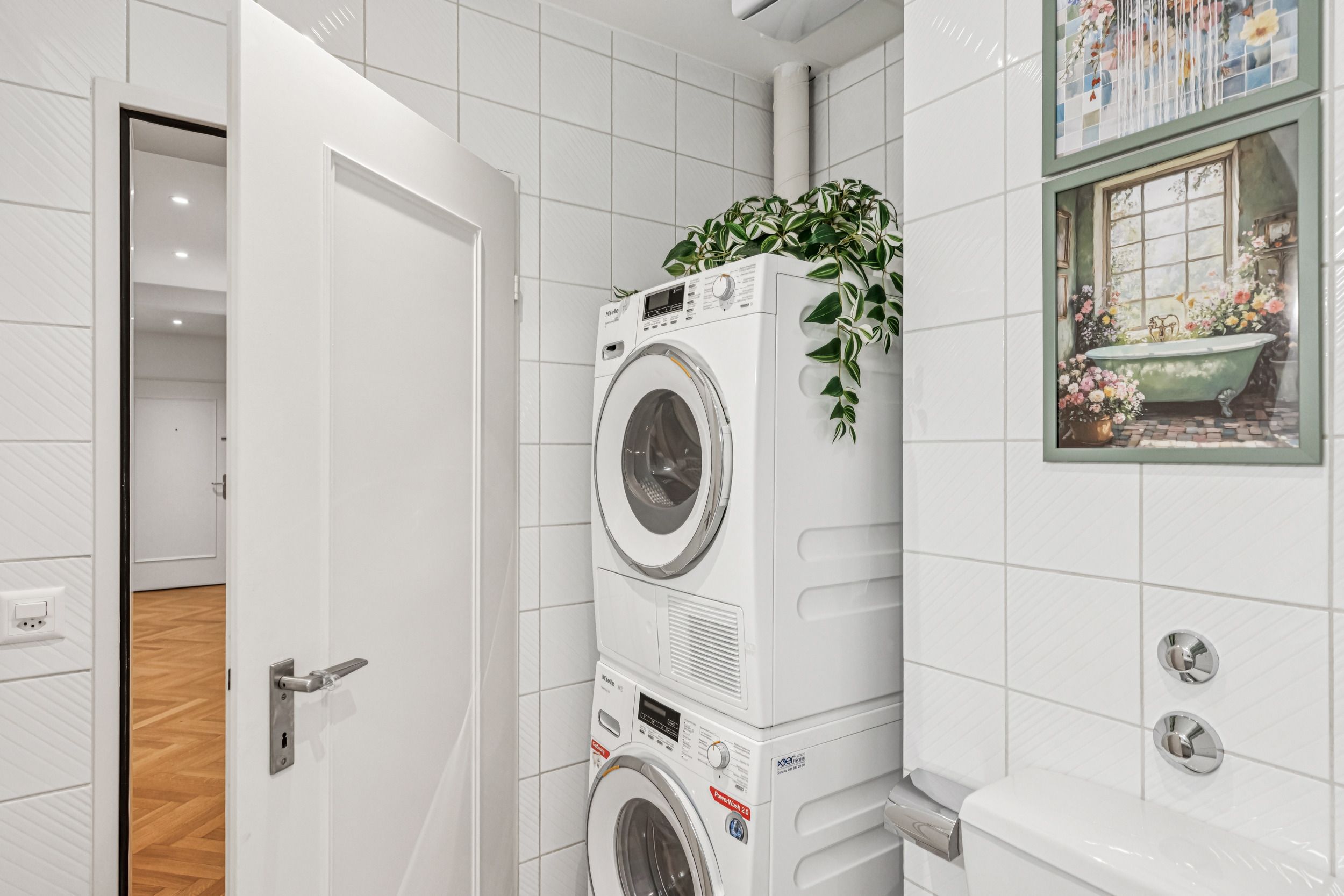 The fully equipped kitchen provides everything needed for cooking and entertaining, while the elegant layout of the apartment offers generous space for living, working, and relaxing.