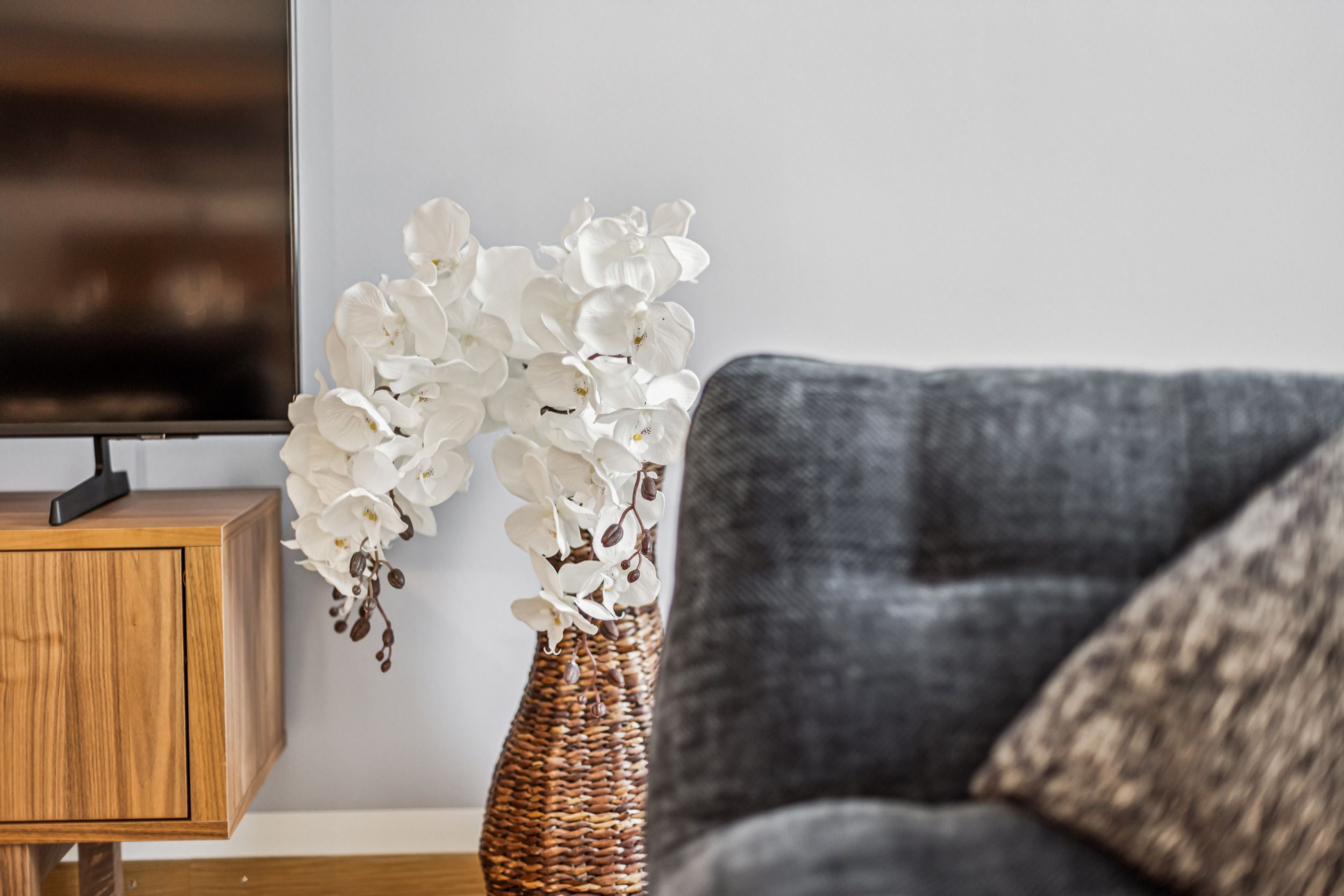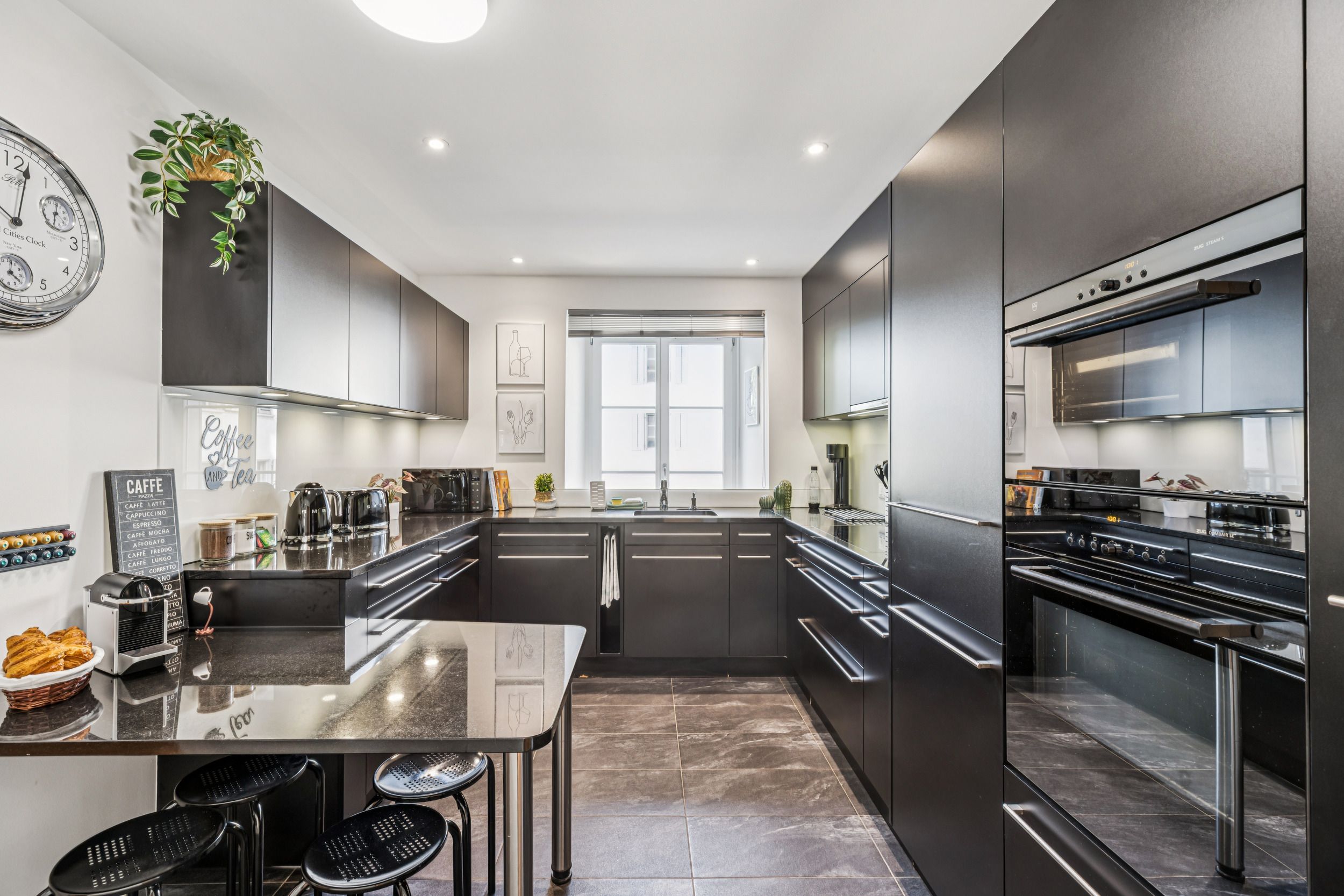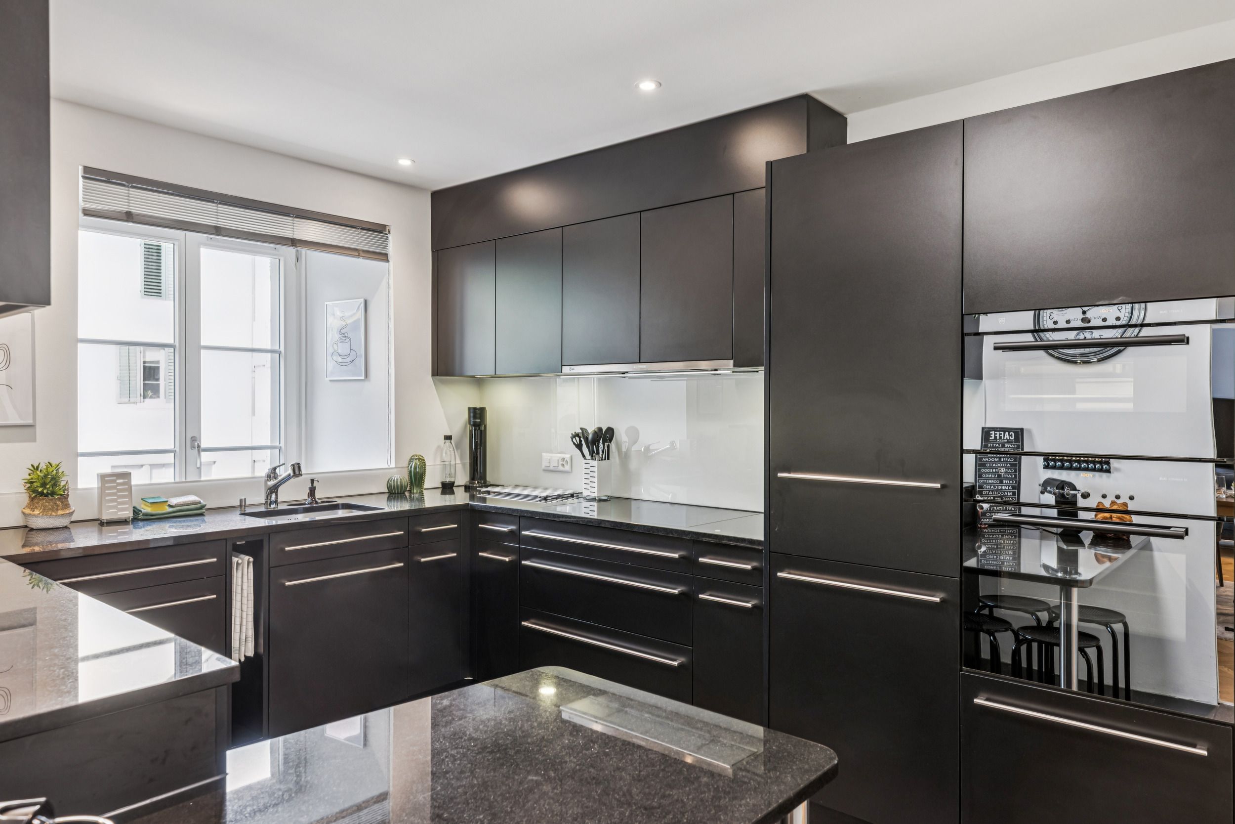 The fully equipped kitchen provides everything needed for cooking and entertaining, while the elegant layout of the apartment offers generous space for living, working, and relaxing.