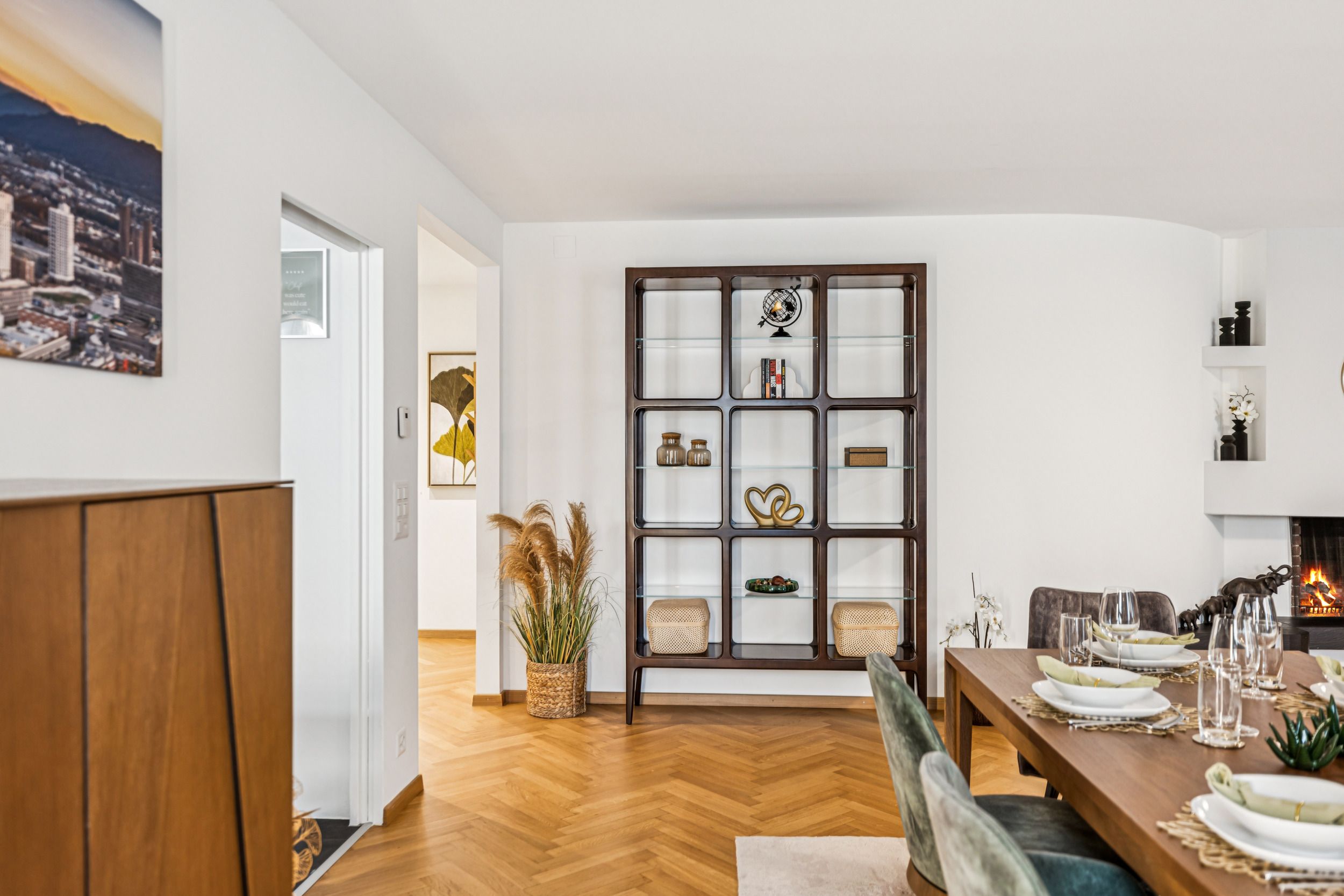 Inside, the apartment unfolds into elegant, spacious interiors designed for both comfort and style. The grand living and dining area forms the heart of the home, featuring designer Roche Bobois furnishings, a generous dining table for gathering, and large windows framing breathtaking views of the famous Grossmünster. The atmosphere is both refined and welcoming, perfect for relaxing evenings after exploring the city.